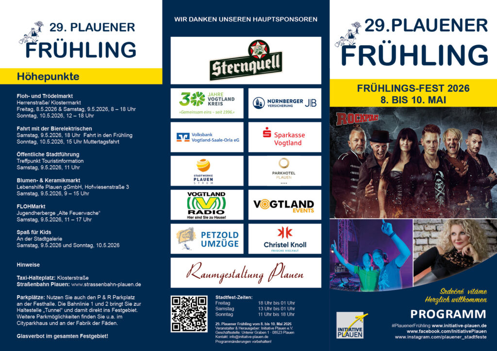29. Plauener Frühling – Das Stadtfest für die ganze Familie Der 29. Plauener Frühling lädt Sie vom 08.05. – 10.05.2026 [...]